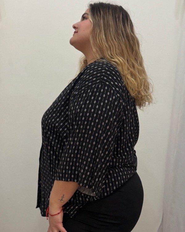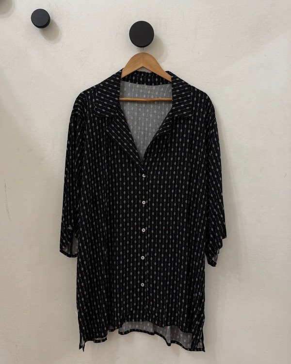Camisa de fibrana estampada , manga corta, botones y tajos en los laterales, este modelo viene en 3 talles. A continuación las medidas de los contornos.