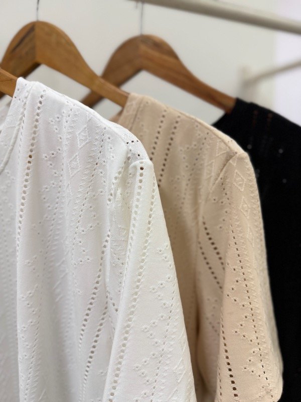 Remera manga corta de broderie elastizado, tela suave y confortable, este modelo tiene un ruedo curvo y el largo es irregular, delicada y sentadora ! Viene en 4 talles superlindos y 3 colores clásicos para darle muchos usos por mocho tiempo. A continuación las medidas.