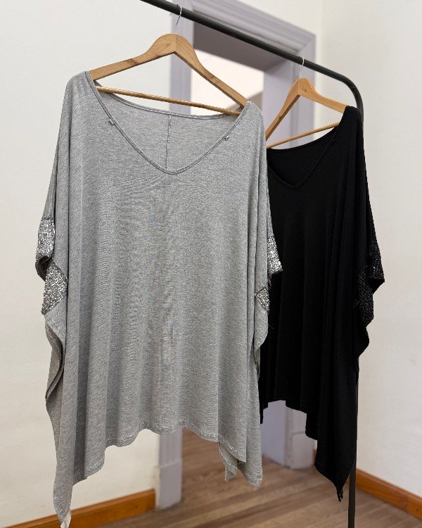 Remera cuello V de viscosa tela suave fresca y con una caída hermosa. Este modelo tiene apliques de lentejuelas en el final de las mangas. Super delicada , es una prenda sencilla para quien quiere destacarse de una forma elegante y discreta , viene en colores negro y gris y es talle único grande, a continuación las medidas (contornos)